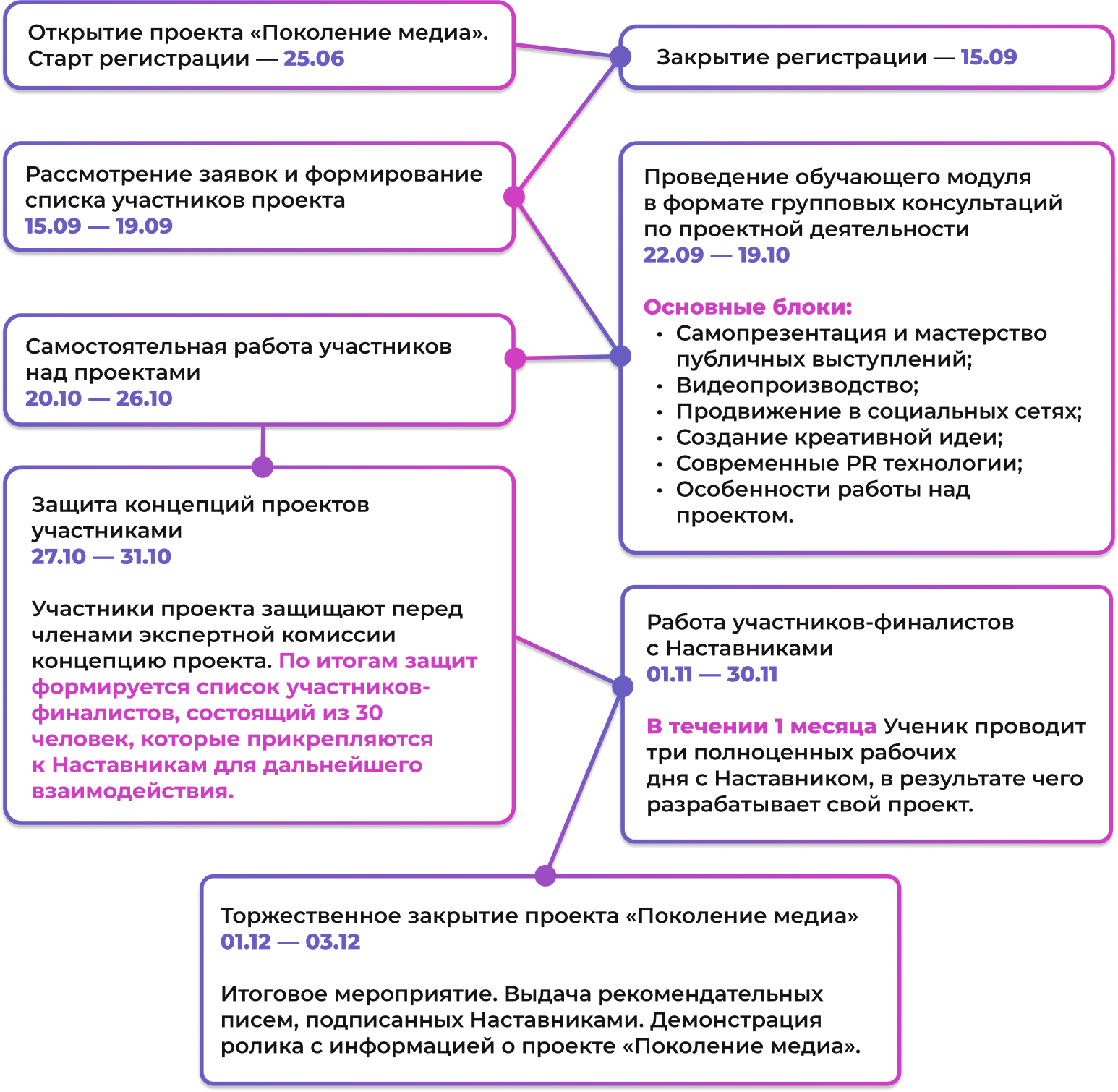 Участие в Проекте «Поколение медиа» могут принять студенты бакалавриата, специалитета, магистратуры всех форм обучения, являющиеся гражданами Российской Федерации или находящиеся в процессе получения гражданства.